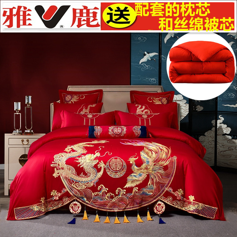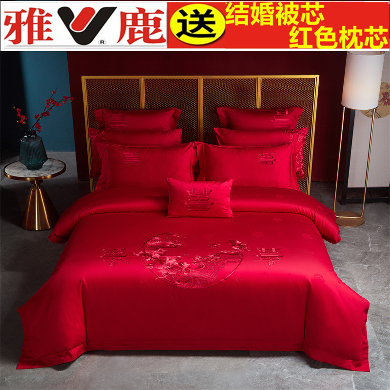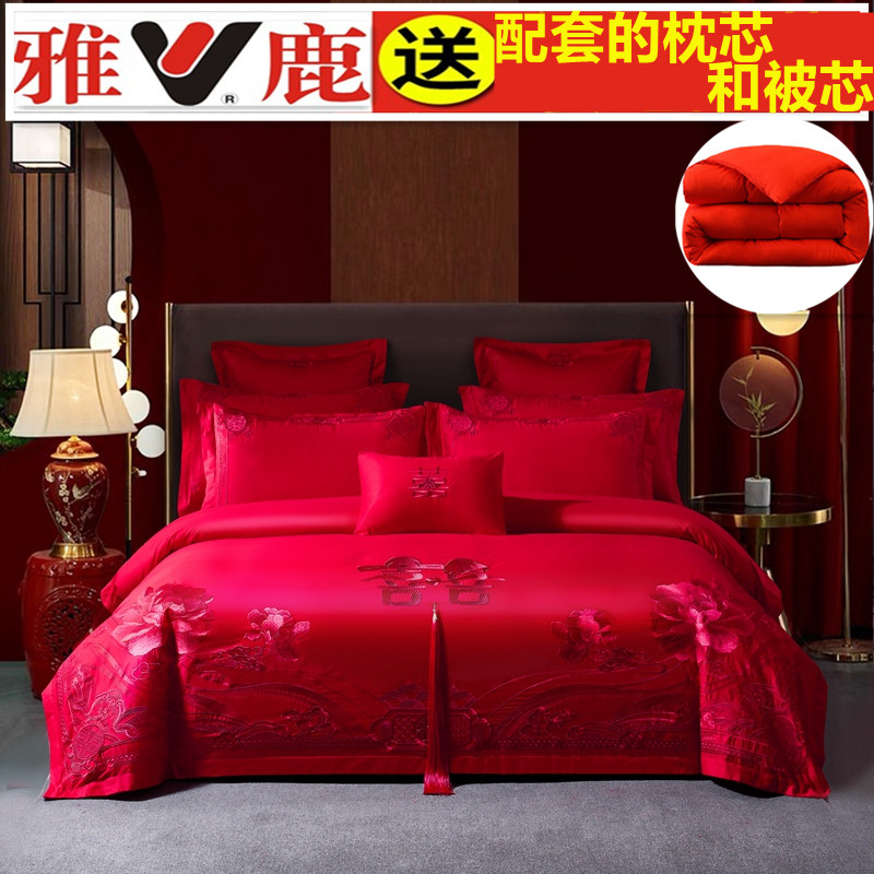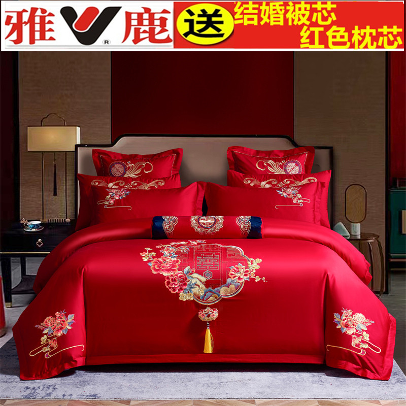 雅鹿家纺结婚全棉四件套纯棉刺绣婚庆大红陪嫁婚房喜被芯新婚床品