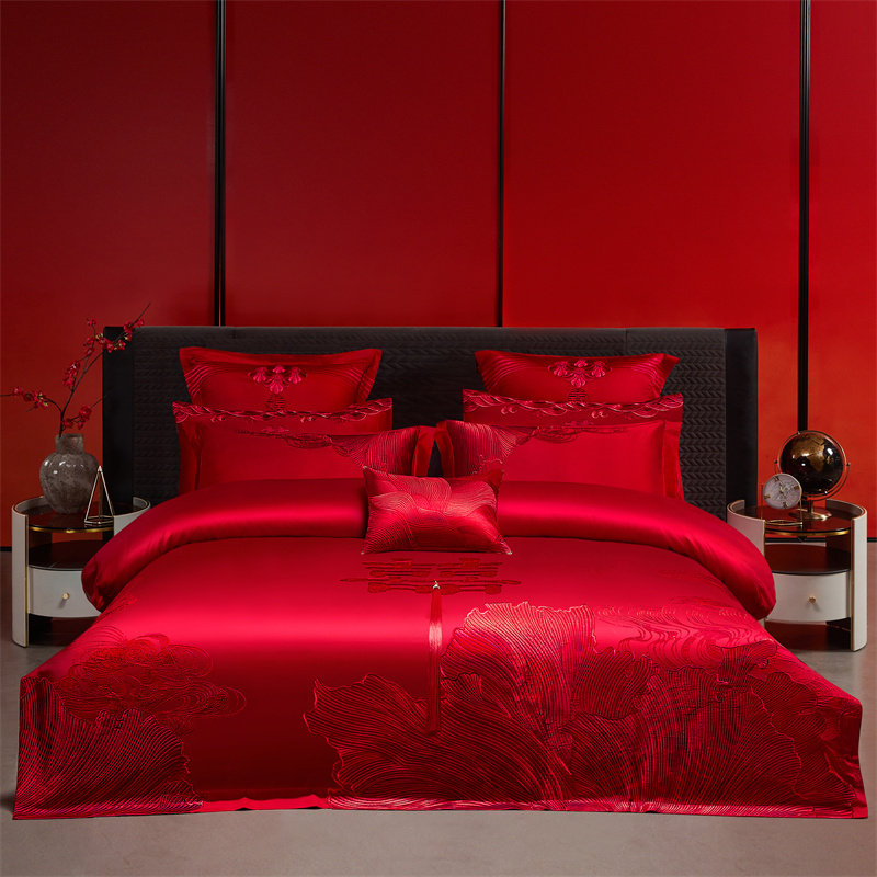 160支纯棉四件套结婚大红色全棉刺绣被套贡缎提花高档雅鹿家纺新
