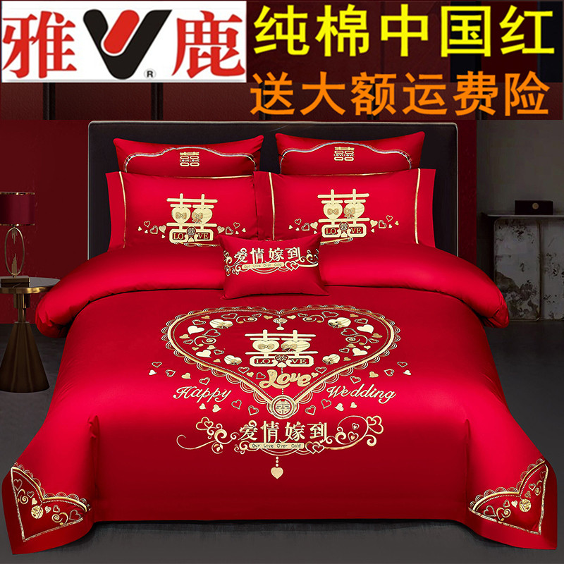 雅鹿家纺结婚全棉四件套纯棉刺绣婚庆大红陪嫁婚房喜被芯床上用品