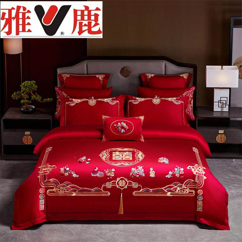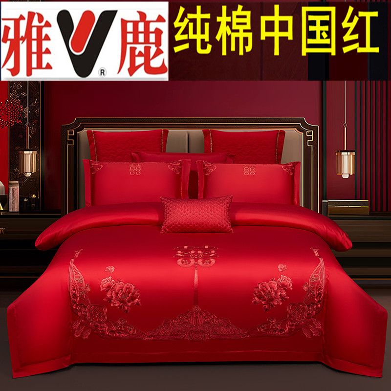 雅鹿家纺纯棉结婚四件套大红色刺绣全棉婚嫁新款嫁妆婚房新婚陪嫁