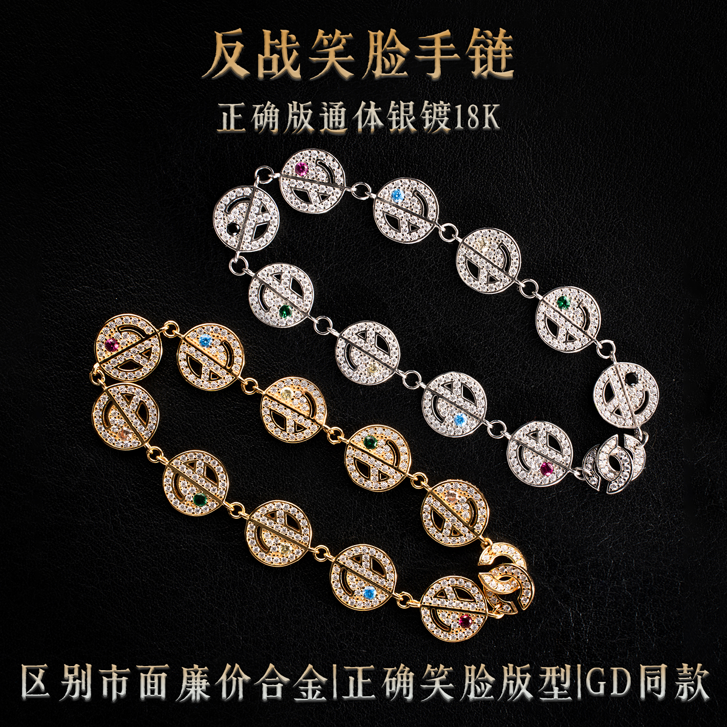 EYEFUNNY风格权志龙GD同款反战笑脸手链18K镀金镶嵌满钻潮流嘻哈