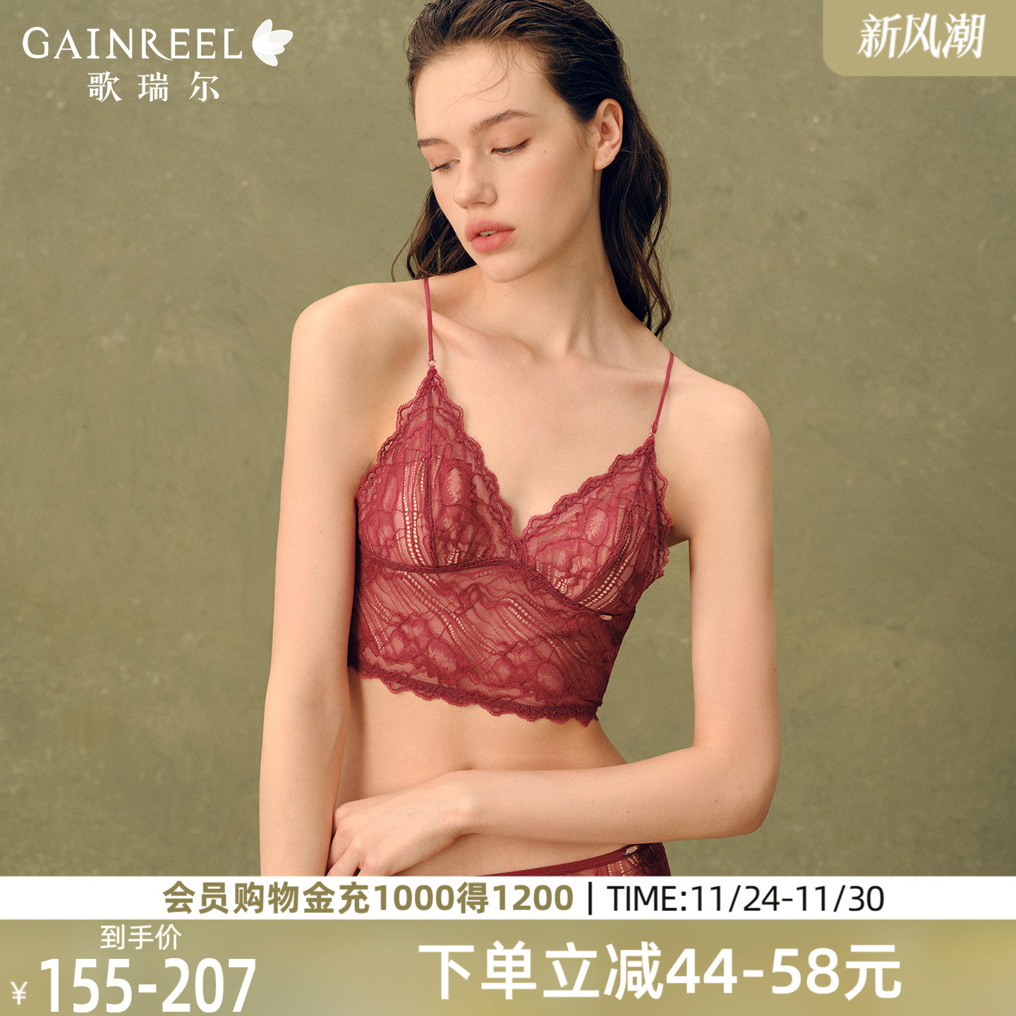 歌瑞尔蕾丝美背内衣女交叉细肩带红色结婚新娘文胸套装法式无钢圈