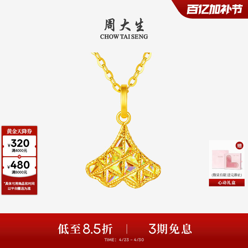 周大生黄金吊坠5G足金爆闪小幸运银杏叶项链小裙子挂坠送女友礼物