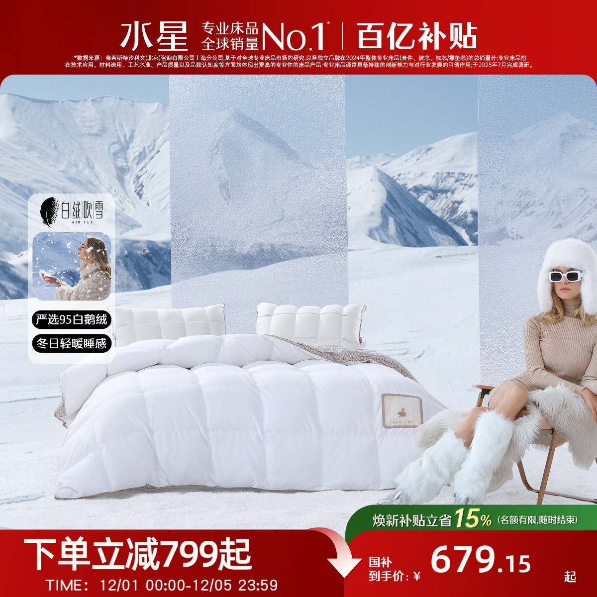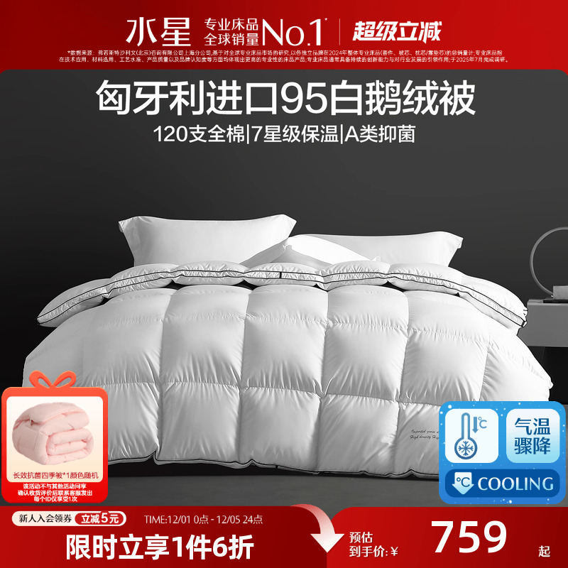 水星家纺A类鹅绒被羽绒被95白鹅绒冬被冬季加厚保暖被芯春秋被子