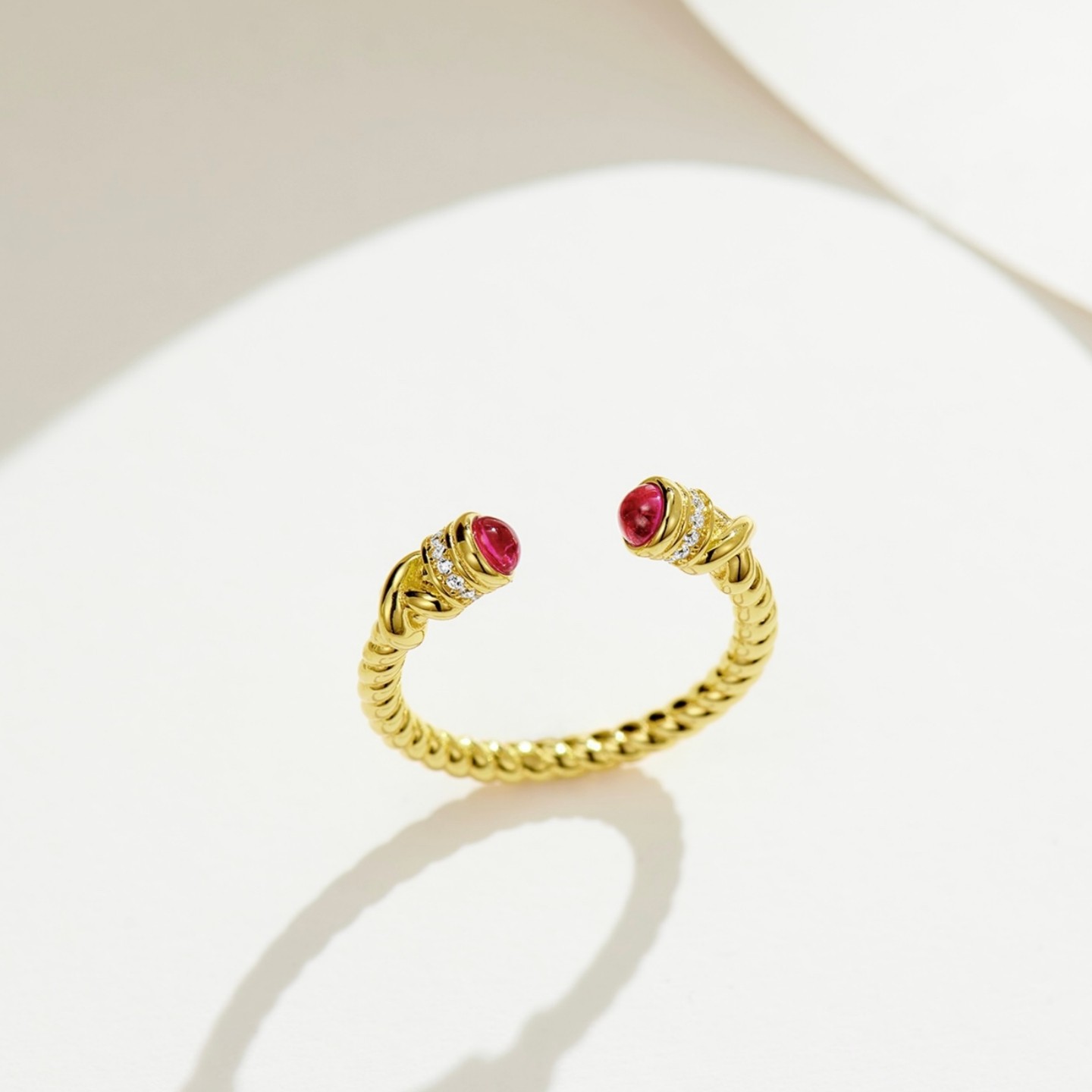ins欧美风叠戴复古红宝石绿宝石麻绳开口戒指 女925纯银镀18K黄金