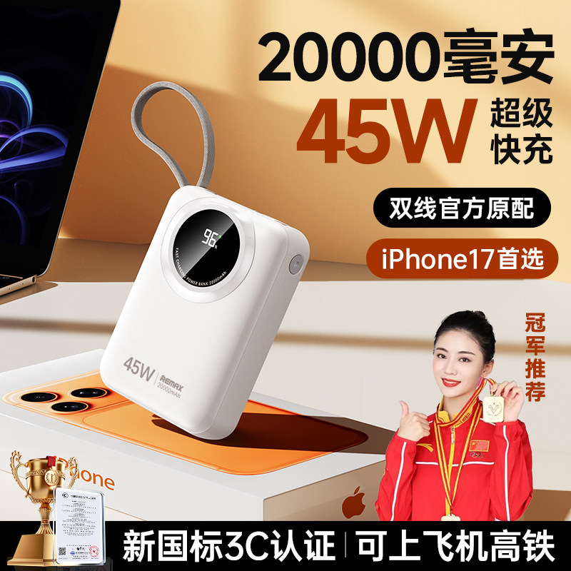 【3c认证可上飞机】remax睿量20000毫安大容量自带线小巧便携充电宝45W快充移动电源火车高铁2026新款苹果17