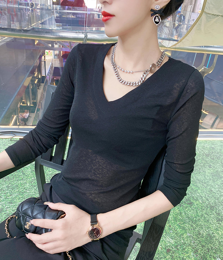 春夏新款v领微透性感长袖t恤女修身显瘦百搭薄款打底衫洋气上衣潮