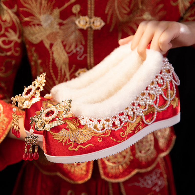 汉服婚鞋女冬季加绒内增高古风红色中式婚礼秀禾鞋新娘结婚绣花鞋