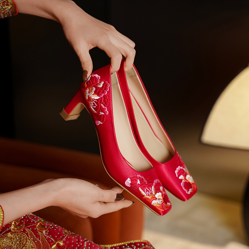 Lusen绝美粗跟婚鞋红色刺绣新娘鞋中式婚礼秀禾鞋高级感不累脚