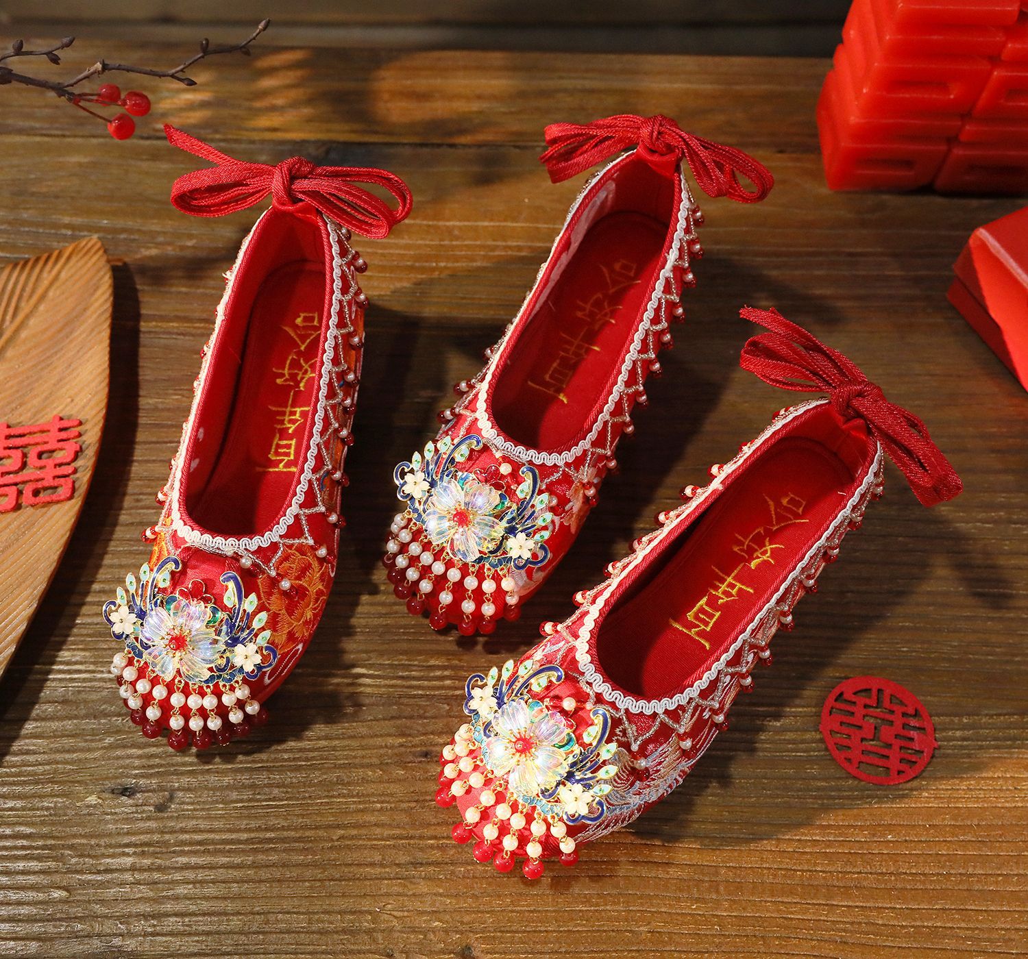 中式婚鞋女原创珍珠流苏红色新娘秀禾鞋平底不累脚配古装汉服婚鞋