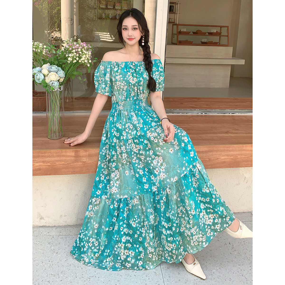 一字肩两穿纯欲棉绸碎花连衣裙长裙夏季短袖沙滩裙波西米亚度假裙