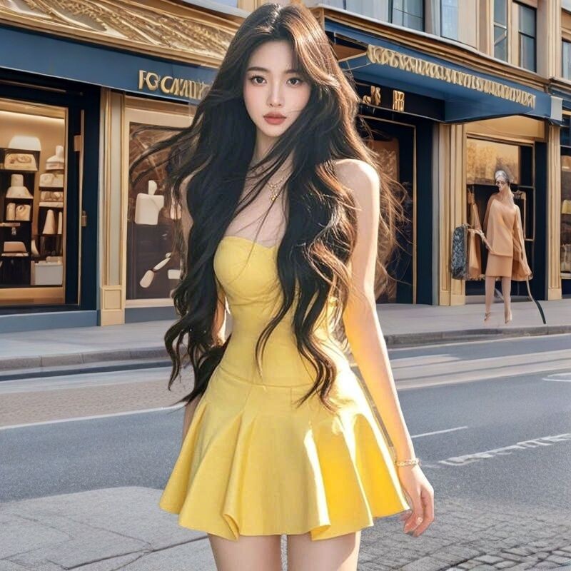 纯欲风辣妹黄色抹胸一字肩a字短裙女2026夏季新款气质显瘦连衣裙
