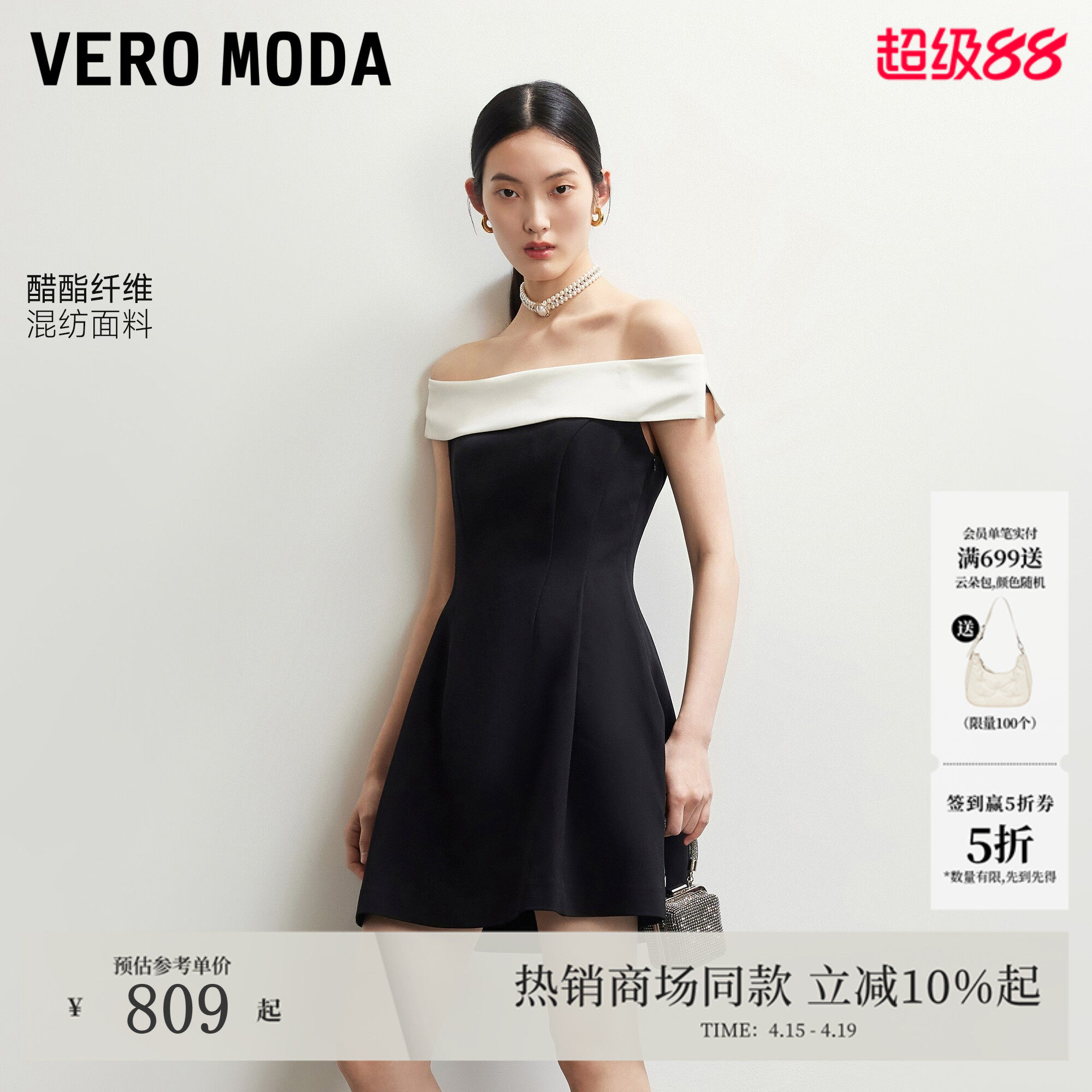 Vero Moda连衣裙2026夏季新款含醋纤撞色一字肩小黑裙32627A012
