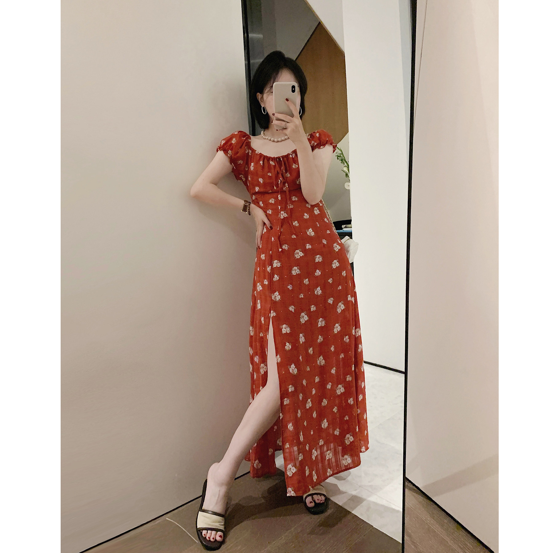 misslady法式复古红色碎花开叉连衣裙一字肩名媛风修身收腰夏度假