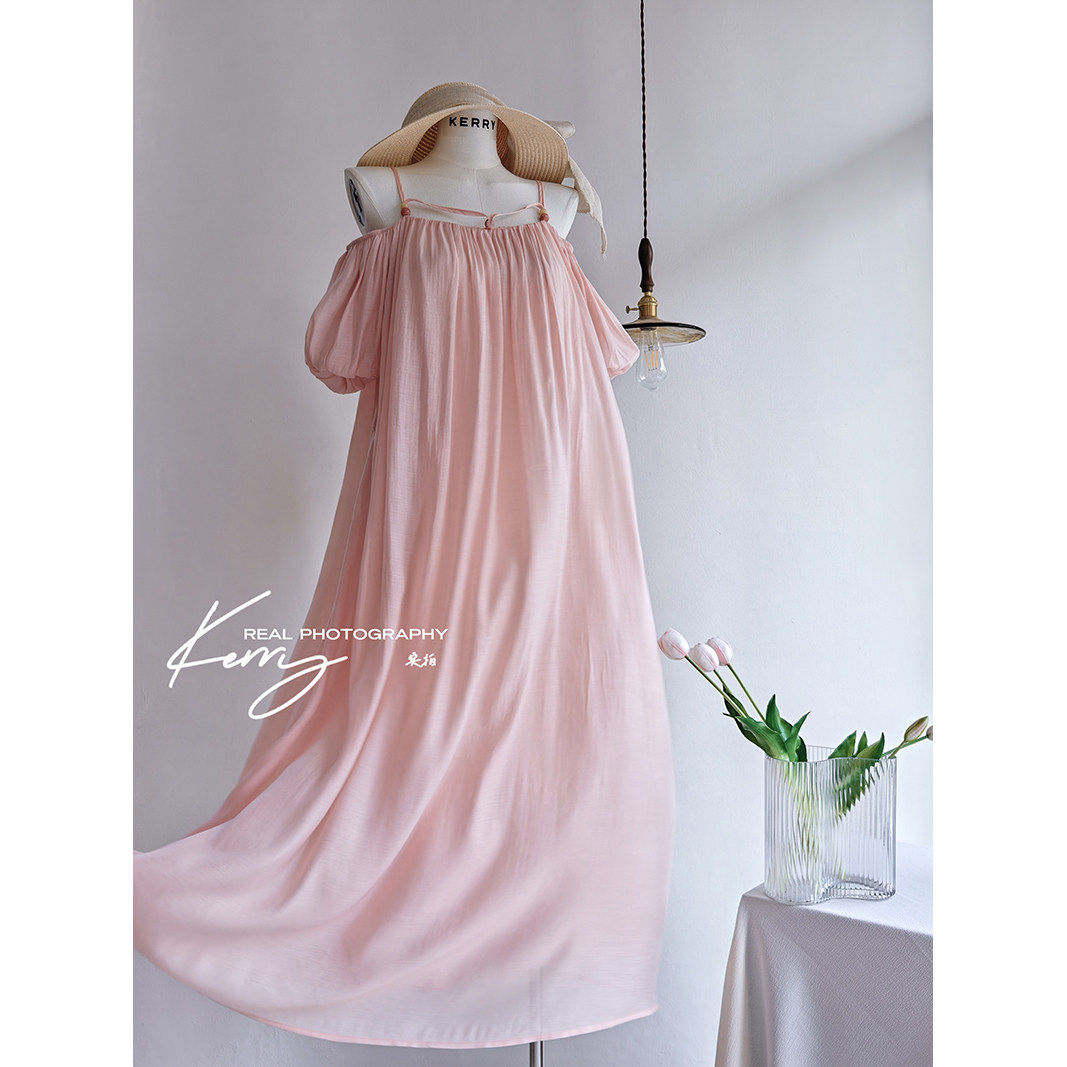 33-58170 前后露锁骨一字肩领系带收腰泡泡袖天丝中长连衣裙夏装