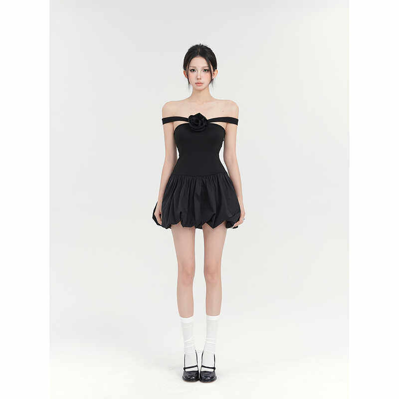 PEMPL 一字肩连衣裙女夏季新款高级感收腰显瘦蓬蓬裙露背短款裙子