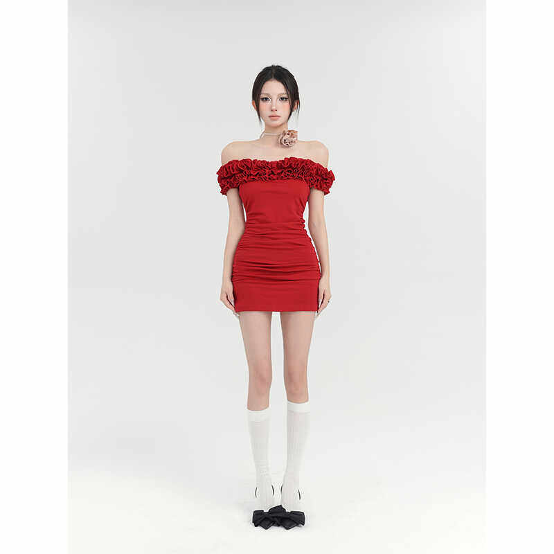DPLAY红色一字肩连衣裙女小礼服订婚气质收腰长裙裙子2026年夏季