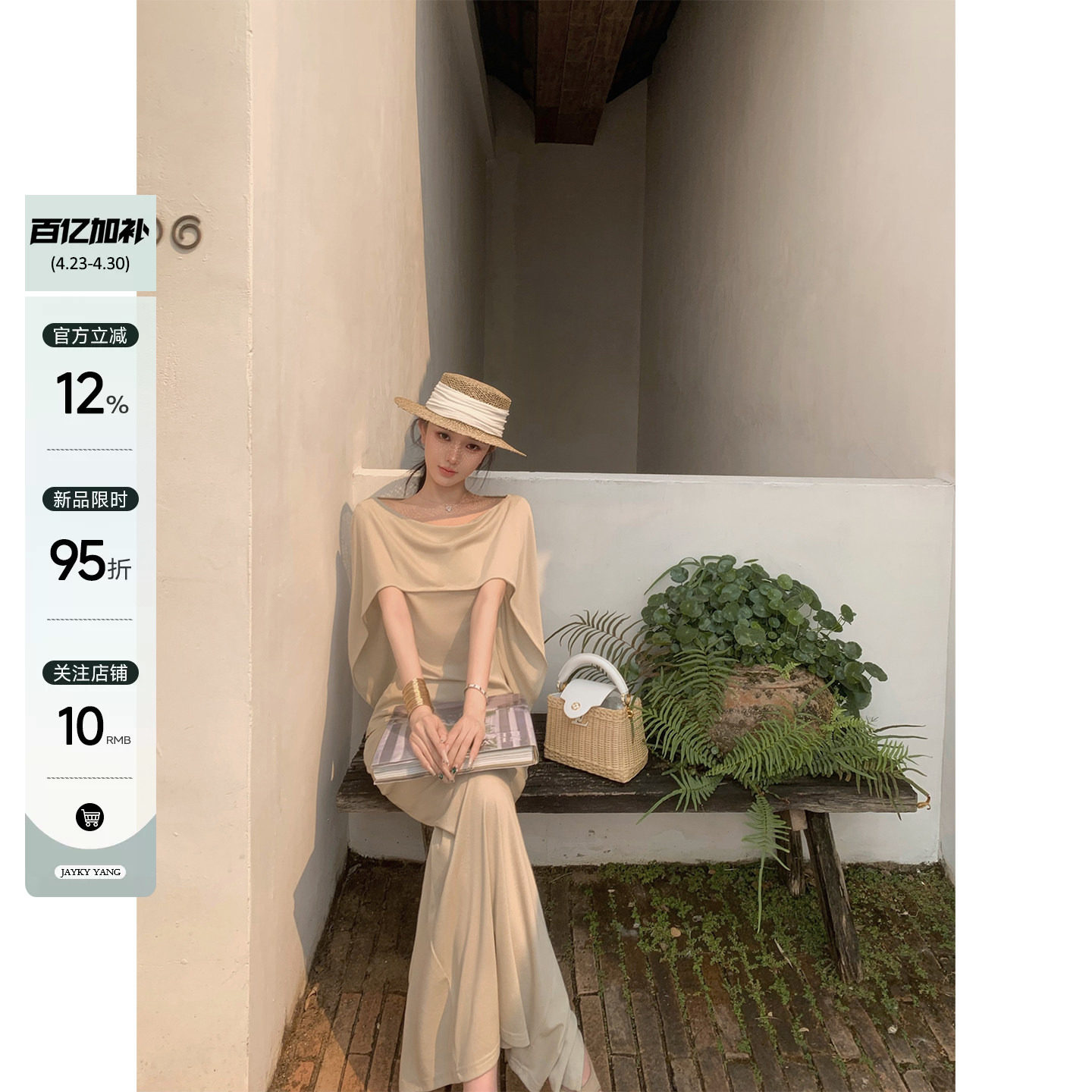 JAYKY YANG【木禾】一字领披肩短袖针织衫后开叉直筒半身裙套装