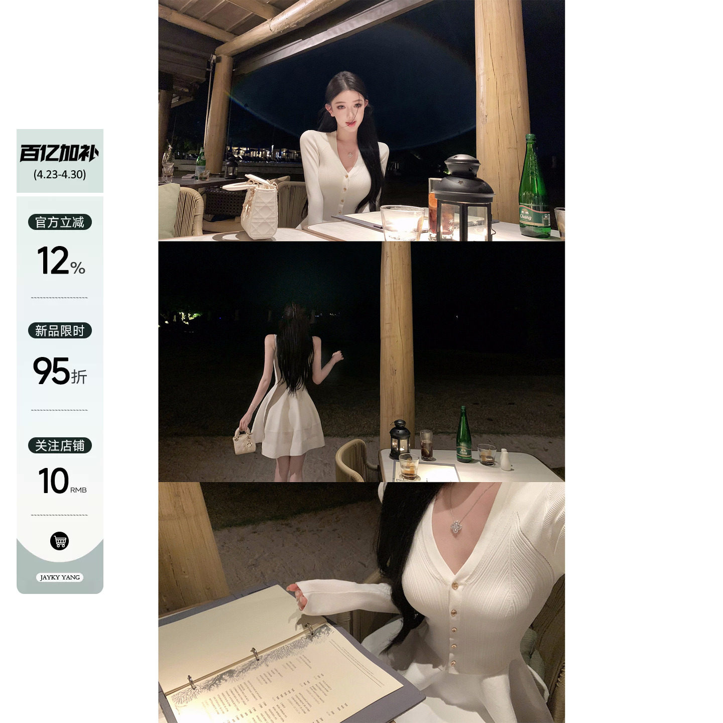 JAYKY YANG【午茶小调】收腰镂空U领针织裙女金扣V领针织开衫套装