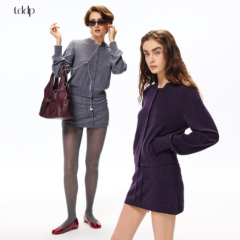 TDDP “Nico同款”羊毛针织套装女长袖开衫外套修身短裙裤两件套