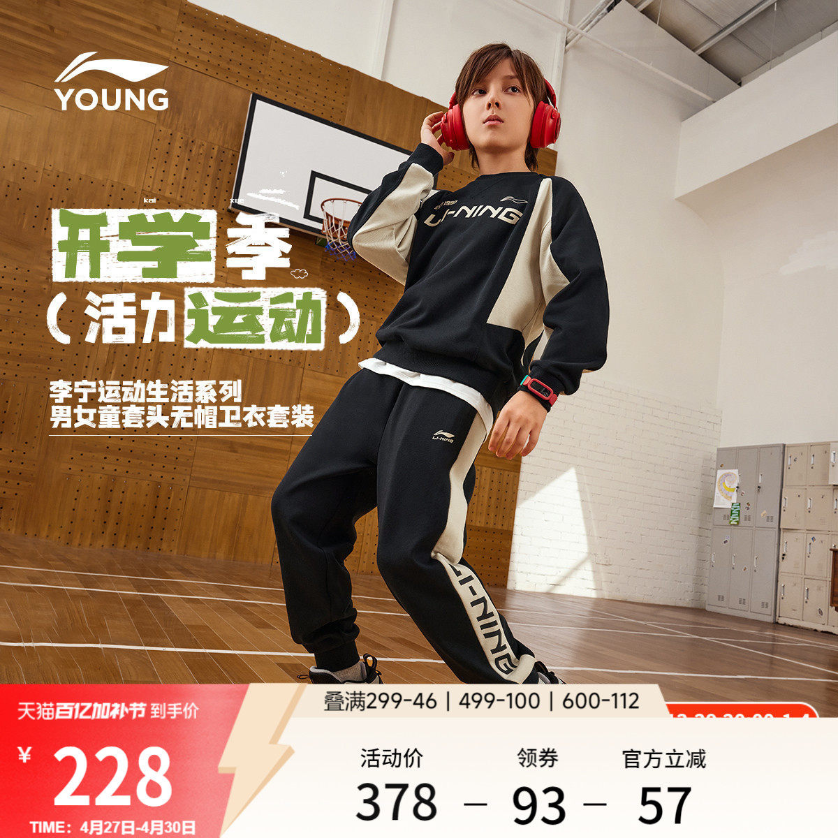李宁童装套装男女小大童运动生活系列套头衫圆领休闲春夏针织童装