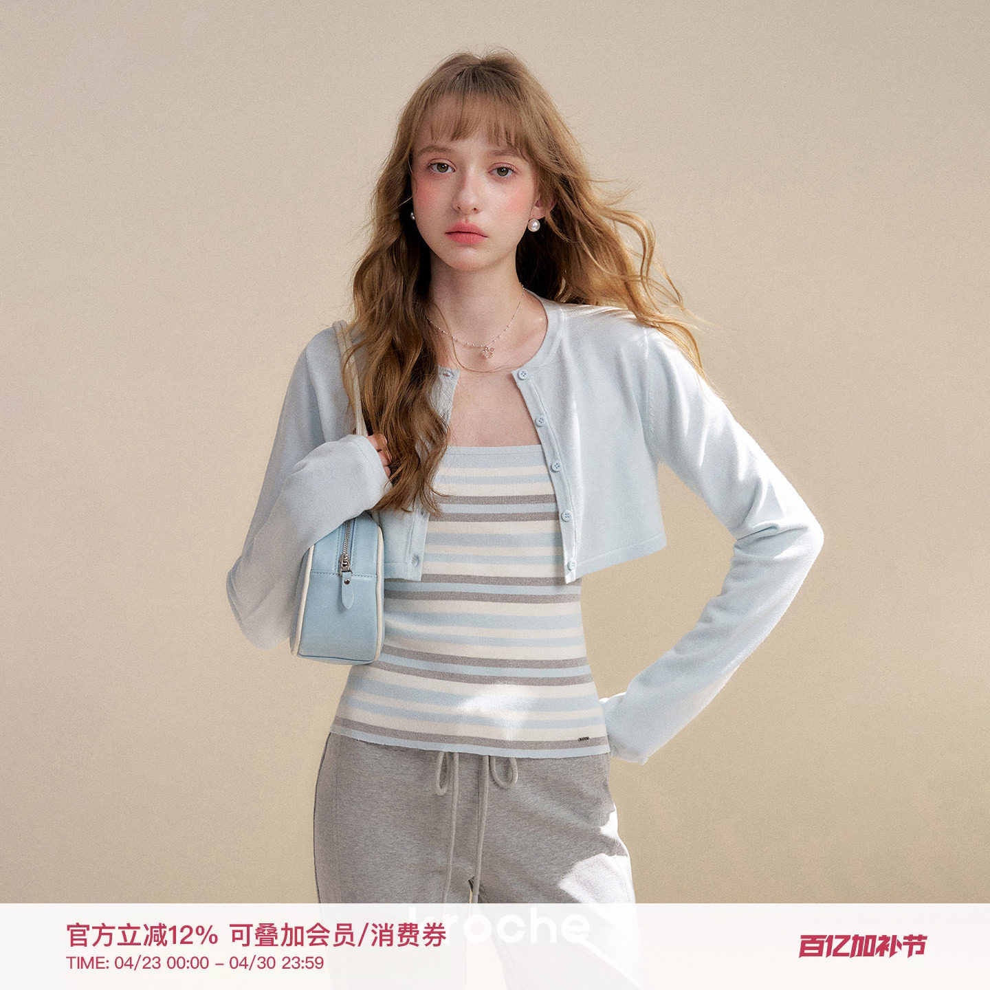 祝绪丹同款 Kroche 26ss 正肩长袖短款针织开衫+修身条纹吊带套装