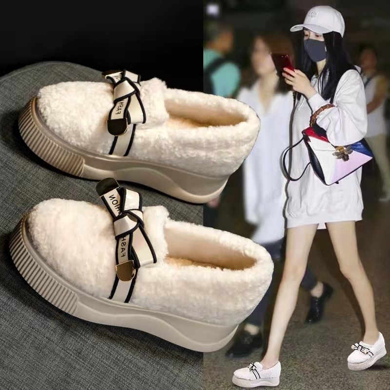 2025新款豆豆鞋女冬加绒保暖一脚蹬毛毛鞋厚底松糕鞋内增高雪地鞋