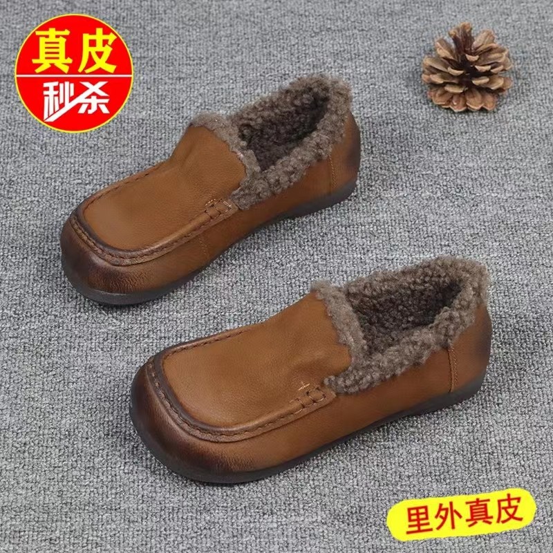 豆豆鞋女冬加绒棉鞋真皮一脚蹬毛毛鞋中老年女士妈妈鞋厚底乐福鞋