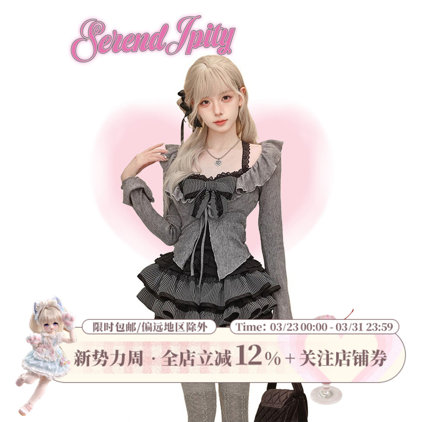 【轻哥特】暮色歌集春秋套装黑色蕾丝吊带+灰色针织开衫+短款半裙