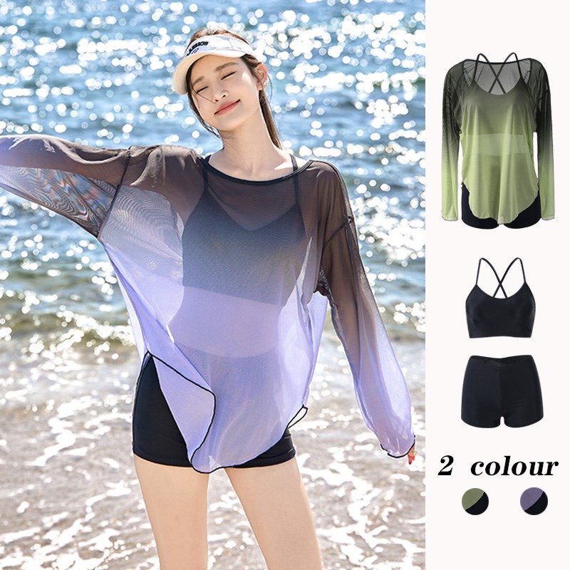 新款泳衣女三件套罩衫长袖防晒渐变色微胖女P孩洋气分体显瘦海边