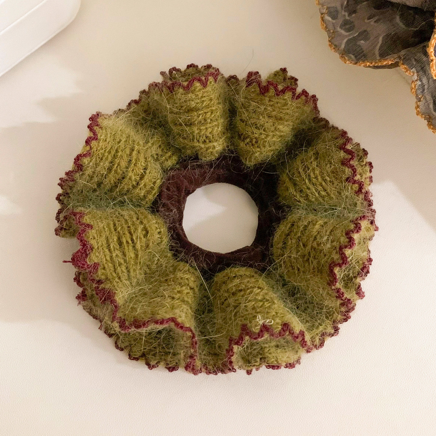 韩国森系超显白果绿撞色针织毛绒蝴蝶结发圈双层软糯高端弹力皮筋