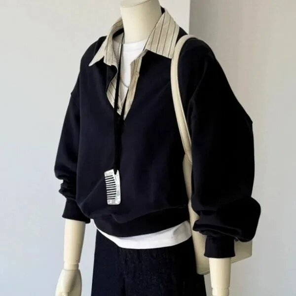 尚静宽松Polo领卫衣女春秋季2025新款韩版拼接落肩套头假两件上衣