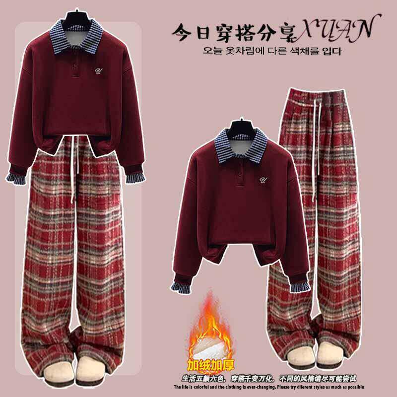 冬季假两件套头卫衣女加绒厚polo领拼接长袖搭配韩版格子裤两件套
