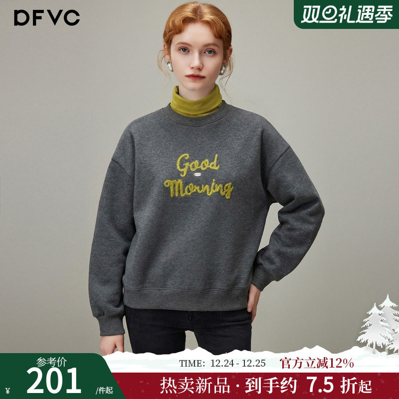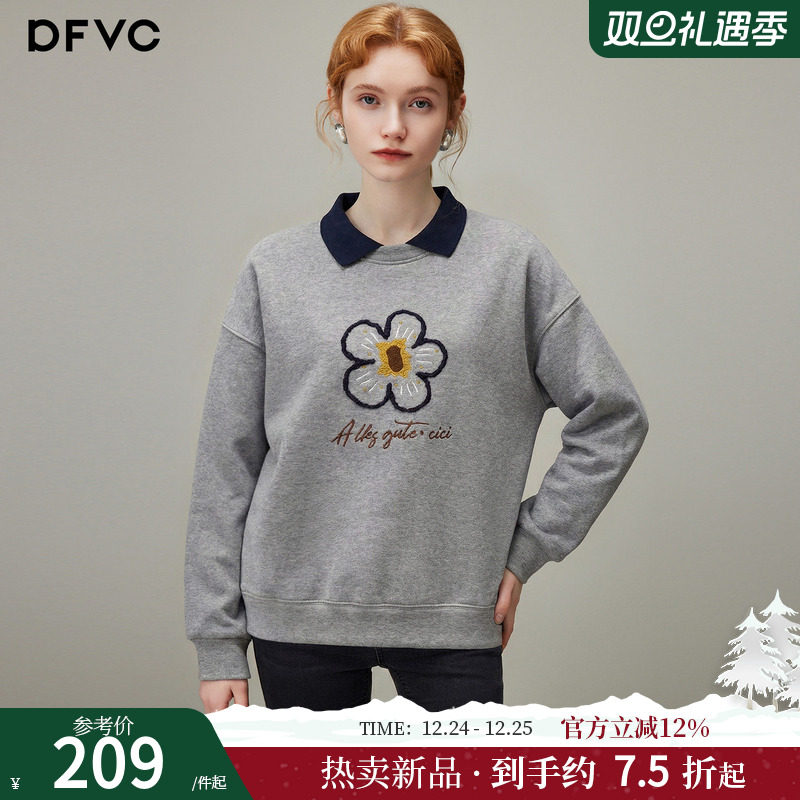 dfvc韩版假两件翻领套头卫衣女2025年冬季新款绣花加绒短款上衣厚