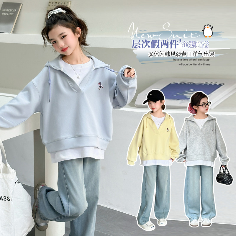 女童卫衣加厚春款2025新款中大童假两件套头衫韩版百搭打底衫外穿