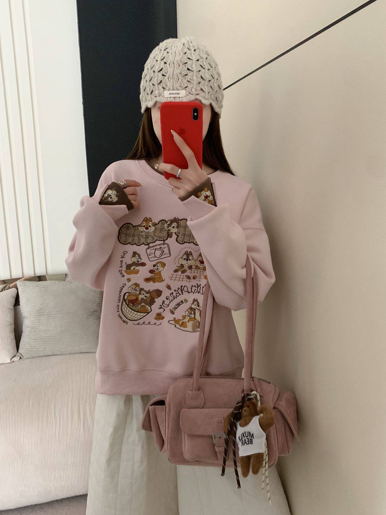 3758奇奇蒂蒂刺绣加绒加厚假两件韩版圆领显瘦通勤卫衣宽松套头女
