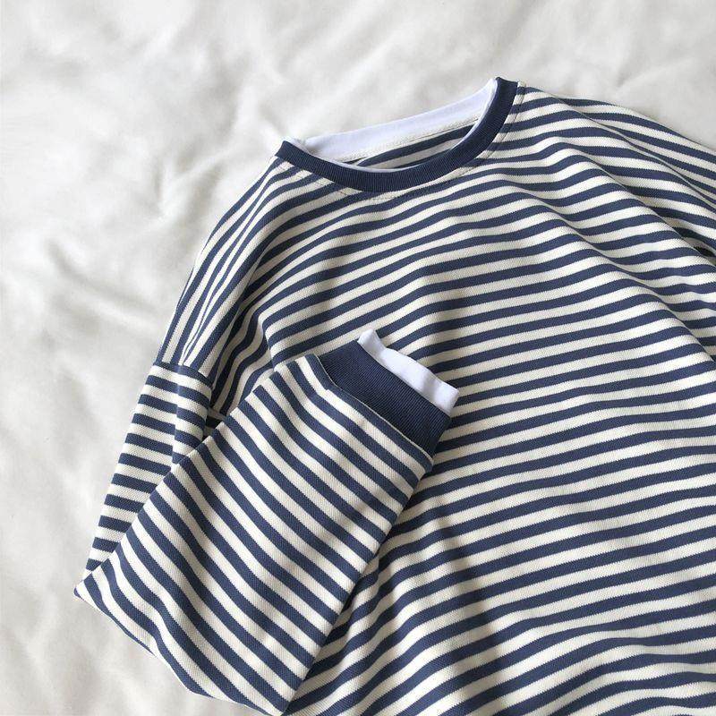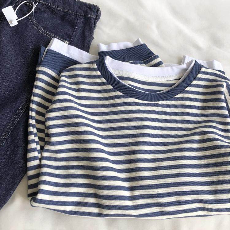 薄款拼接假两件卫衣女春秋宽松韩版圆领套头条纹慵懒风上衣潮ins