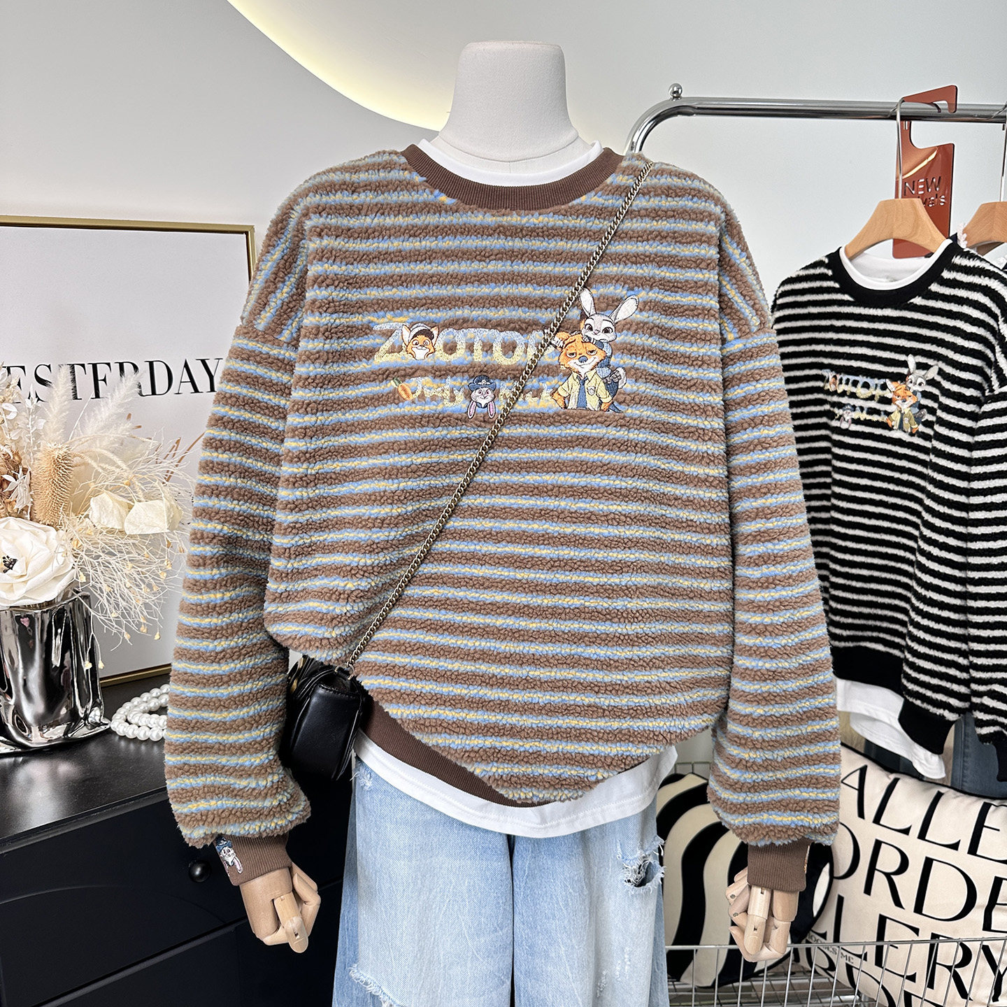 遮屁股中长款假两件卫衣女冬季羊羔毛刺绣卡通宽松百搭条纹套头衫