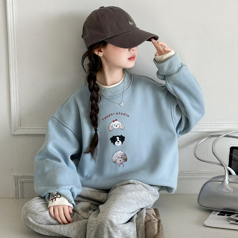 拼接白边假两件卡通刺绣斗牛狗韩版加绒加厚保暖圆领卫衣女套头潮
