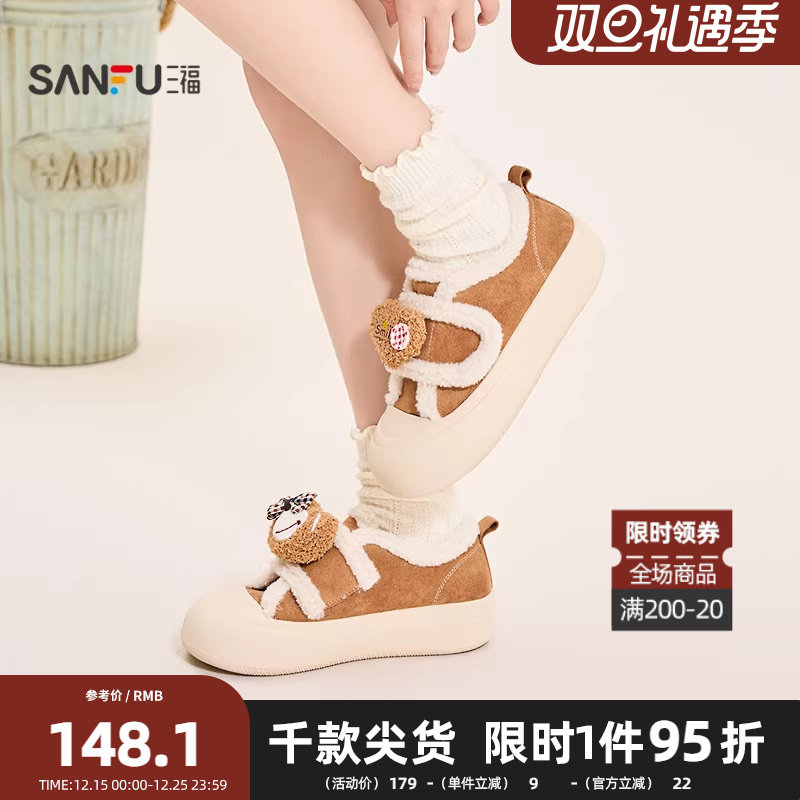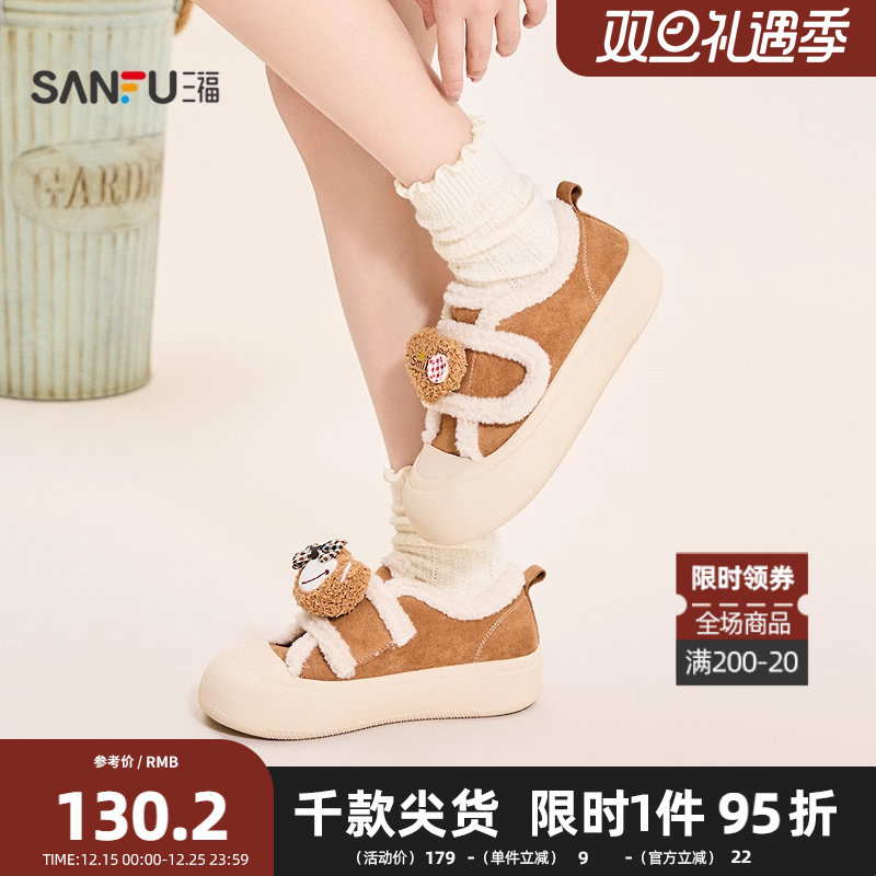 三福女板鞋冬季冬日奇幻乐园爱心小熊魔术贴面包鞋女鞋847960