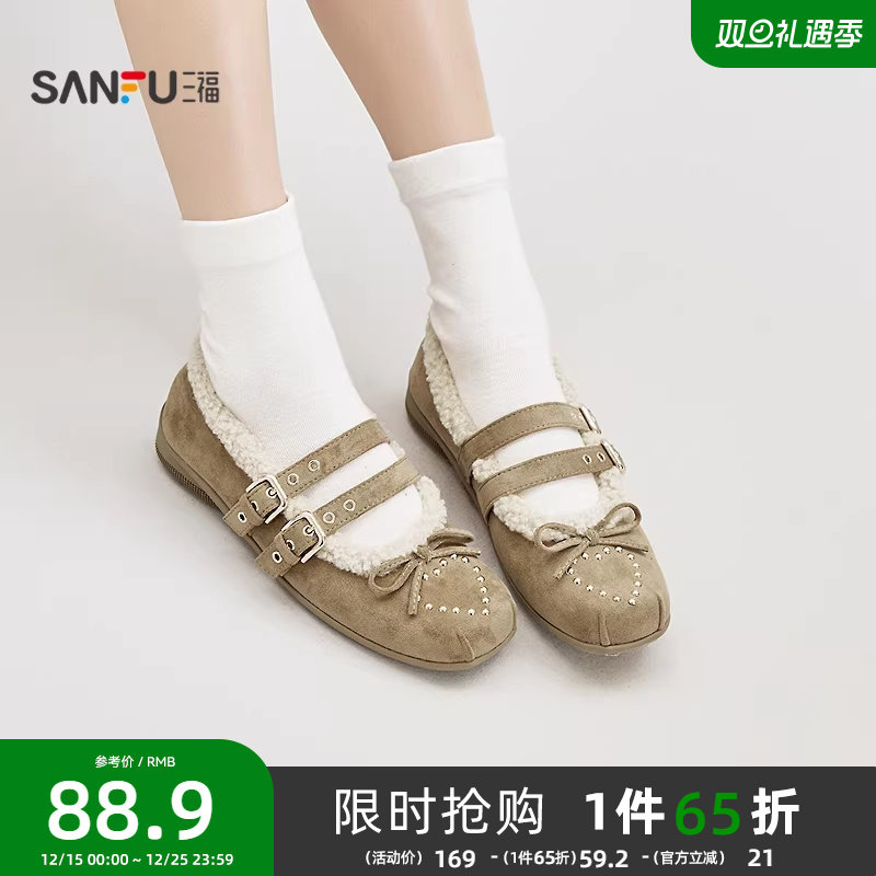三福女毛毛鞋冬季韩系复古甜美风爱心蝴蝶结毛单鞋女鞋850802