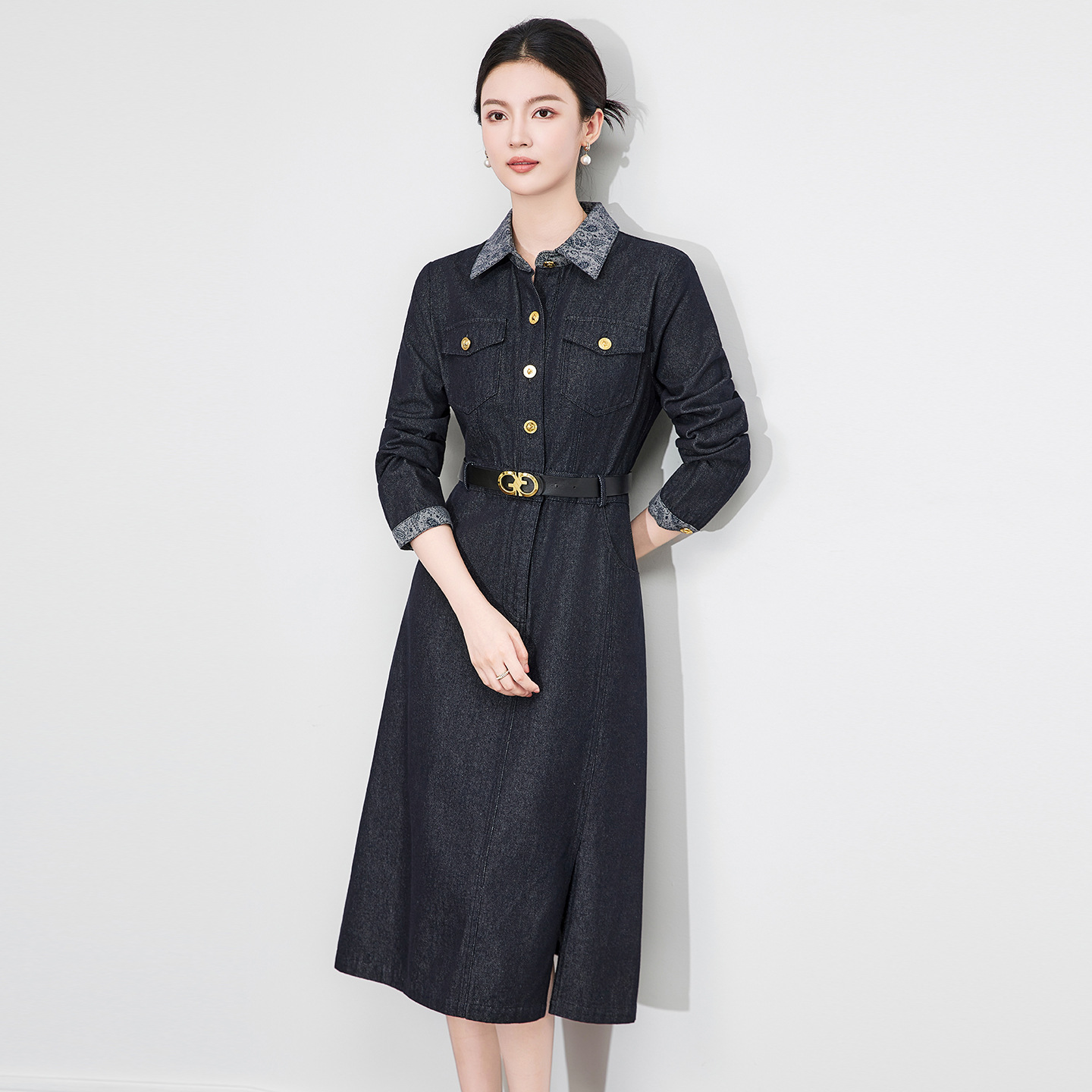 2025秋冬新款女气质高端通勤翻领OL复古牛仔连衣裙收腰修身a字裙