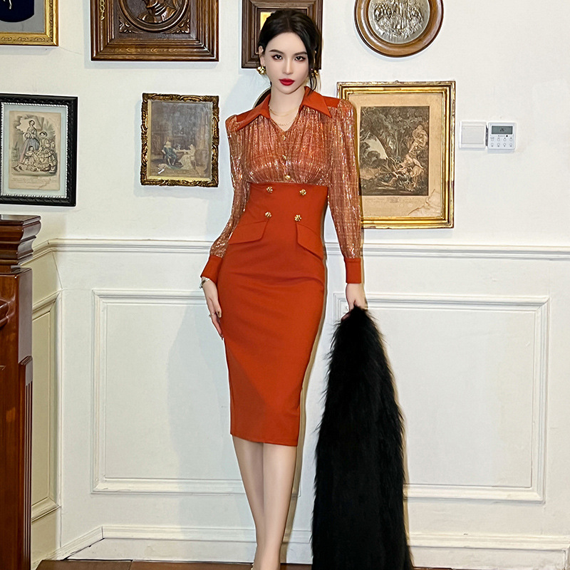 2025秋装新款女装OL通勤职业装翻领拼接高腰包臀长袖连衣裙50727