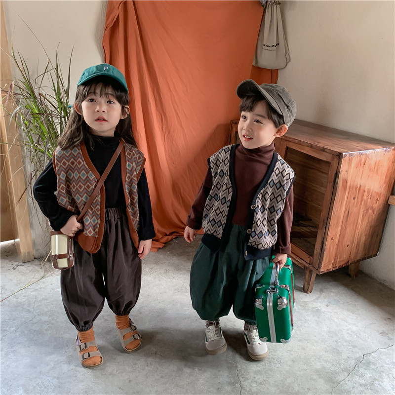 男童2021秋季新款全棉菱形格毛线马甲女宝宝森系复古针织背心外套