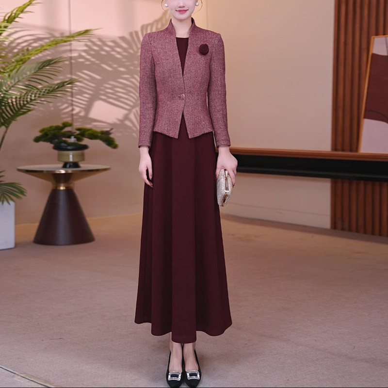 酒红色假两件连衣裙女2025冬新款高级感呢子裙修身显瘦大摆连衣裙