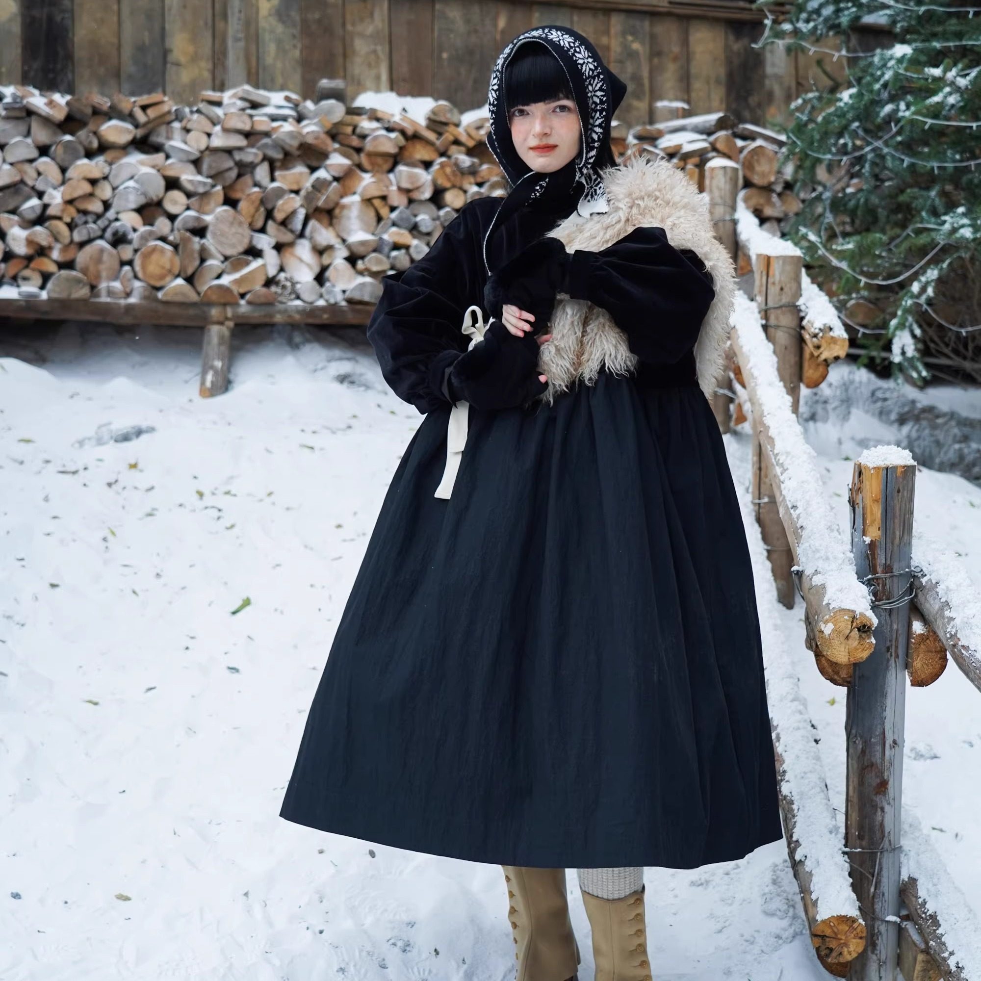 加厚重磅 弥爱原创《神秘诗社》法式复古呢料大摆连衣裙小黑裙冬