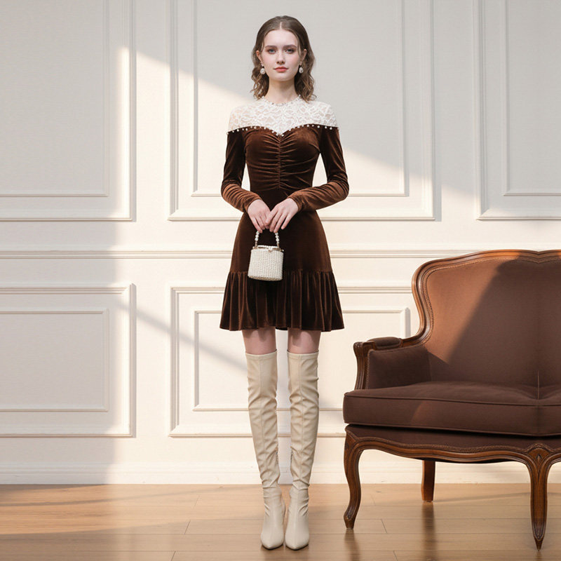 2025年冬季新款法式洋气高级感钉珠蕾丝拼接丝绒收腰大摆连衣裙