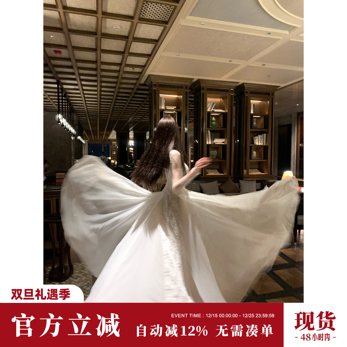 酒午自制【皎玉】法式复古镂空性感蕾丝边V领吊带大摆连衣裙女夏