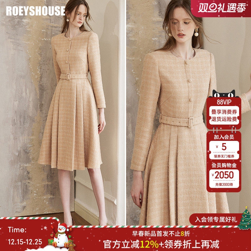 罗衣法式贵气小香风收腰大摆连衣裙女冬季粗花呢系带中长裙09601