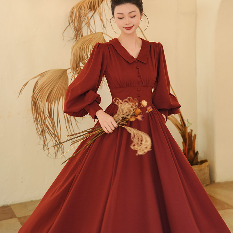 酒红色大摆连衣裙女2025年新款秋冬高端优雅气质修身显瘦长款裙子
